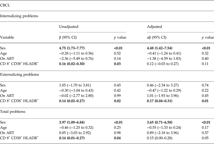Regression models for CBCL were adjusted for gender, age, ART status and CD8T-cell activation. Gender was associated with higher Internalizing and TPs scores (aβ = −4.48, 95%CI −1.42 to 7.54). Girls scored on average 4.48 points higher in the Internalizing scale and 3.65 points in the TPs scale (i.e. more behavior problems) (Table 3). Higher percentage of CD8+ CD38+ HLADR+ were associated with higher scores in the EPs Scale (aβ = −0.17, 95% CI −0.04 to 0.31) and the TPs Scale (aβ = −0.15, 95% CI −0.00 to 0.28) of the CBCL (Table 3).