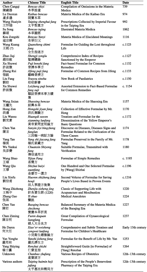 In order to show the porousness of the boundaries between elite and popular medicine, and between religious and medical knowledge during the period, this study utilises both medical and non-medical sources. With regard to the medical sources, I examined the references to opium poppy in over thirty medical treaties from the Tang and Song dynasties, which I list in Table 1. Apart from the official materia medica, this research focuses especially on over twenty Song-dynasty non-official medical treaties, which were compiled by local doctors across China. These abundant sources provide us with a clear picture of changes in the Chinese physicians’ understanding of the properties of opium poppy at the time.Footnote 11 Also, unlike official sources, these treatises endow us with valuable information about the medical use of the poppy, such as the location where it was used or the context in which particular recipes were encountered. Alongside these medical sources, I also utilised accounts by literati of the period in order to investigate the transmission of the medical use of opium poppy. For this paper, I looked into the works of fourteen literati in order to unveil how they became acquainted with the medical use of the flower and the reasons why they consumed it. In that sense, they provide us with relevant information about the consumption of the flower in the Buddhist context, and how it may have influenced the medical practices of lay communities around China. These sources are also relevant because they comprise some of the most valuable accounts on the connections between Buddhism and daily life in Song-dynasty China.Footnote 12 By combining these different sets of sources, I provide a nuanced account of the assimilation of the flower into Chinese medicine; one which highlights the role of Chan Buddhist medical practices in Song medicine.