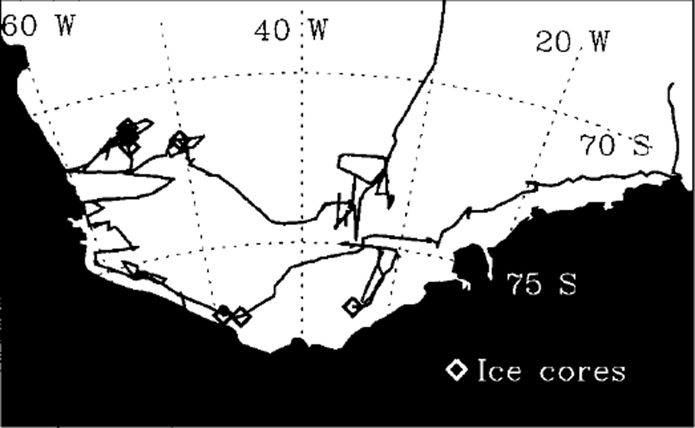 Fig. 2. Ship track in the southern weddell sea of hms Endurance in january-february 1998. the tracks taken between 50° and 60° w (76−72° s) had never been previously transited by vessel and were possible only because of unprecedented open-water conditions (fig. 1) at this time. sea-ice cores were taken at indicated locations.