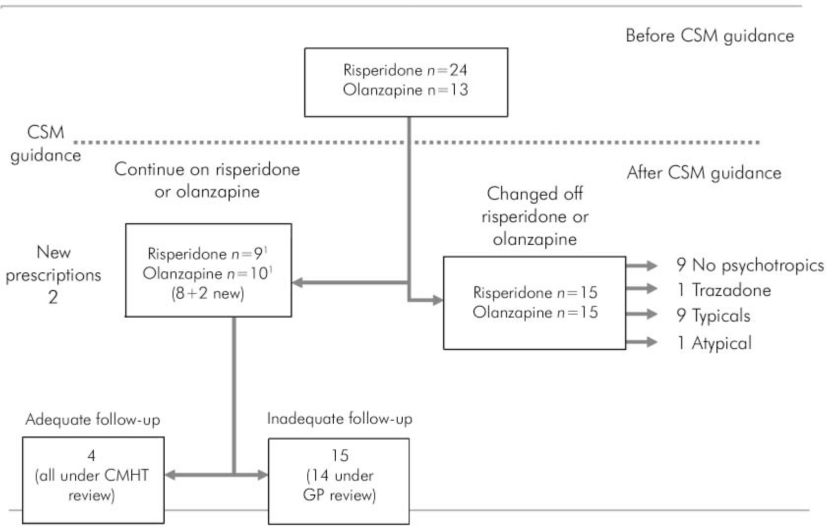 The outcome for residents who were on risperidone or olanzapine before the CSM advice is summarised in Fig. 1. Before CSM advice 69% (37 out of 54) of the antipsychotics prescribed to residents with a diagnosis of dementia were either risperidone or olanzapine. This reduced to 39% (19 out of 49) after the CSM advice, and resulted in a significant drop in the atypical to typical antipsychotic ratio, from 3.1:1 before CSM to 1.04:1 after CSM.