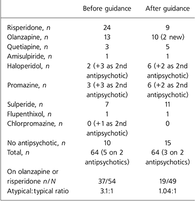 | Total, n | 64 (5 on 2 antipsychotics) | 64 (3 on 2 antipsychotics) |