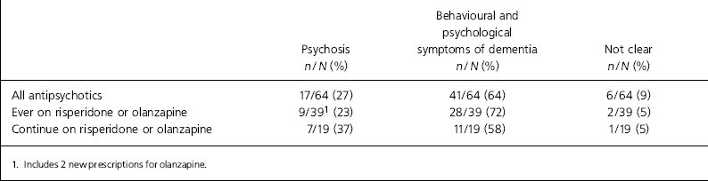 Whatever the rationale for the CSM guidelines, they have prompted a welcome reconsideration of antipsychotic use in this vulnerable population. It is of concern that 46% of residents with dementia in the care settings examined here are receiving antipsychotics, often without adequate review. It is also concerning that 64% of residents with dementia are being prescribed antipsychotics for behavioural symptoms and not for psychosis. The extent to which CSM guidelines have been followed is patchy. For the majority of residents with dementia who were on risperidone or olanzapine, an attempt at withdrawal was made, but for 30% there was no such attempt. It is noteworthy that the two new prescriptions for olanzapine were for psychosis. In this community sample there was less success in withdrawing antipsychotics compared with specialist practice in a CMHT for older people (details available from authors); for example, only one resident was successfully changed to a different psychotropic drug treatment (trazadone).