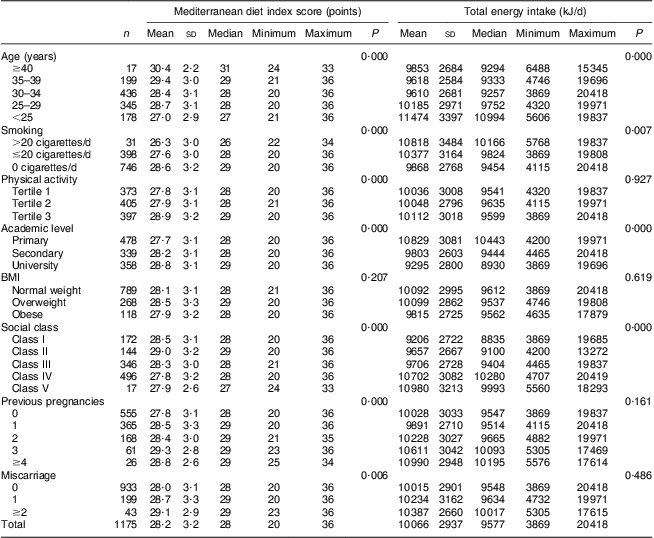 Table 1 Mediterranean Diet Adherence Index score( Reference Serra-Majem, Ribas-Barba and Salvador 35 ) and total energy intake before pregnancy among healthy Spanish women (n 1175), Virgen de las Nieves University Hospital of Granada, southern Spain, June 2004 to March 2007