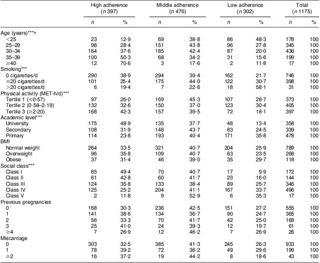 Table 2 Sample description for each level of adherence to the Mediterranean diet before pregnancy among healthy Spanish women (n 1175), Virgen de las Nieves University Hospital of Granada, southern Spain, June 2004 to March 2007