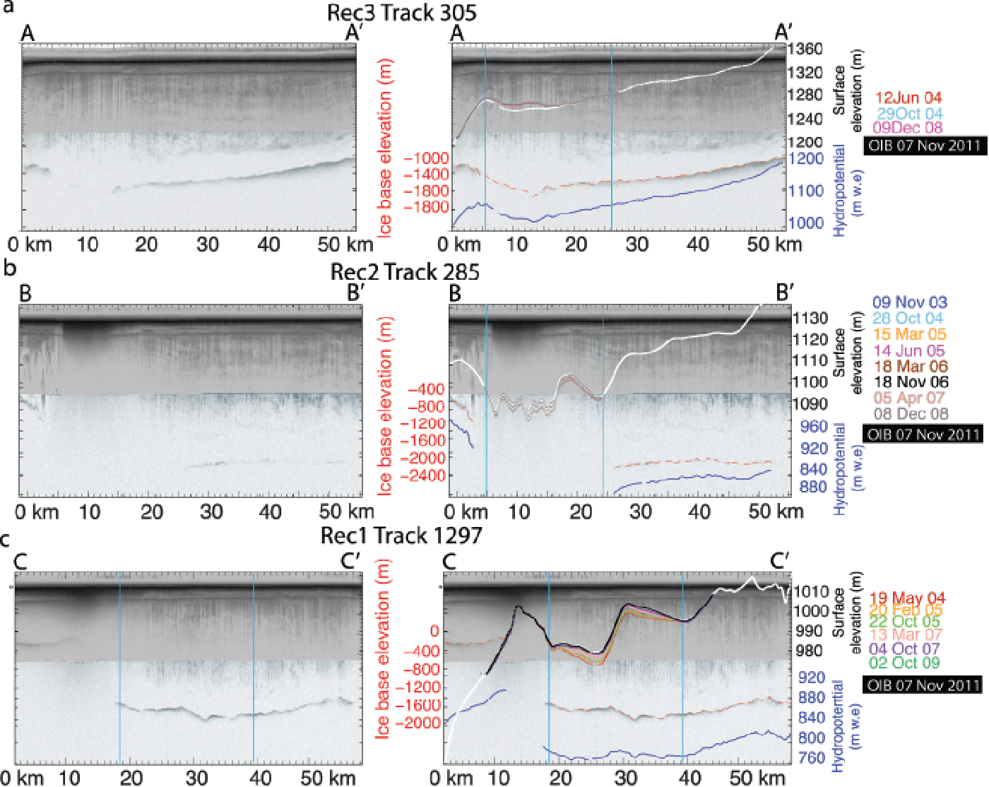 Fig. 5. IceBridge radargrams (unannotated at left) for three ICESat tracks that cross the lower three Recovery lakes: (a) track 305 Rec3; (b) track 285 Rec2; and (c) track 1297 Rec1. On each annotated radargram, the coloured lines towards the top are the surface elevation profiles from the ICESat repeats that were within 1 km of the IceBridge line (repeat dates at right in corresponding colours), and the white line is the IceBridge ATM surface elevation. The central line is the bed elevation picked from the radargram, and the bottom line is the hydropotential.
