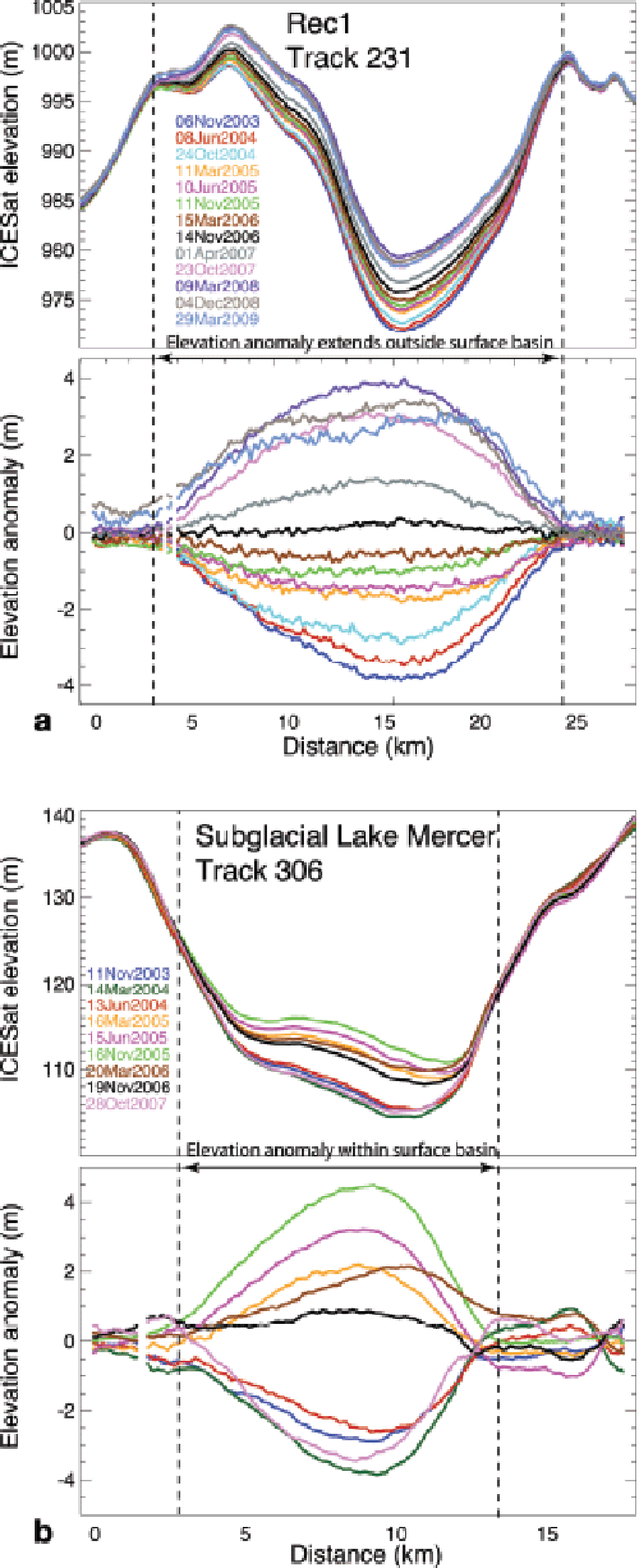 Fig. 8. Typical ICESat elevation anomalies along ICESat tracks that cross subglacial lakes on (a) Recovery Ice Stream and (b) Mercer Ice Stream, showing the different extent of the elevation anomalies with respect to the surface topography. See Figure 1 inset map for location of Mercer Ice Stream in West Antarctica.