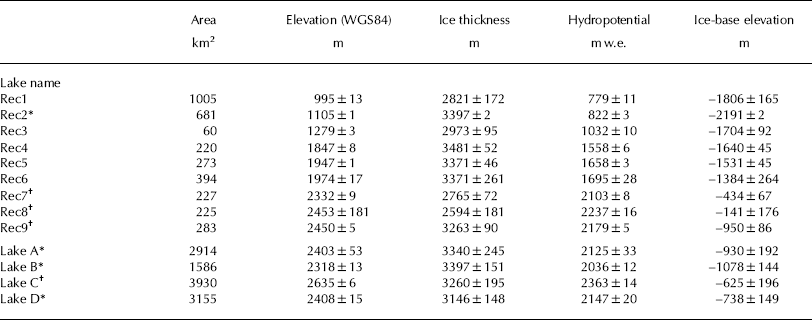 Table 1. Statistics of the nine lakes in the Recovery system identified using 2003–09 ICESat data in this study, and the four lakes discovered by Reference Bell, Studinger, Shuman, Fahnestock and JoughinBell and others (2007). Unless otherwise indicated, values were obtained from mean and standard deviation of all IceBridge measurements of ice thickness and surface elevation occurring within the lake boundary
