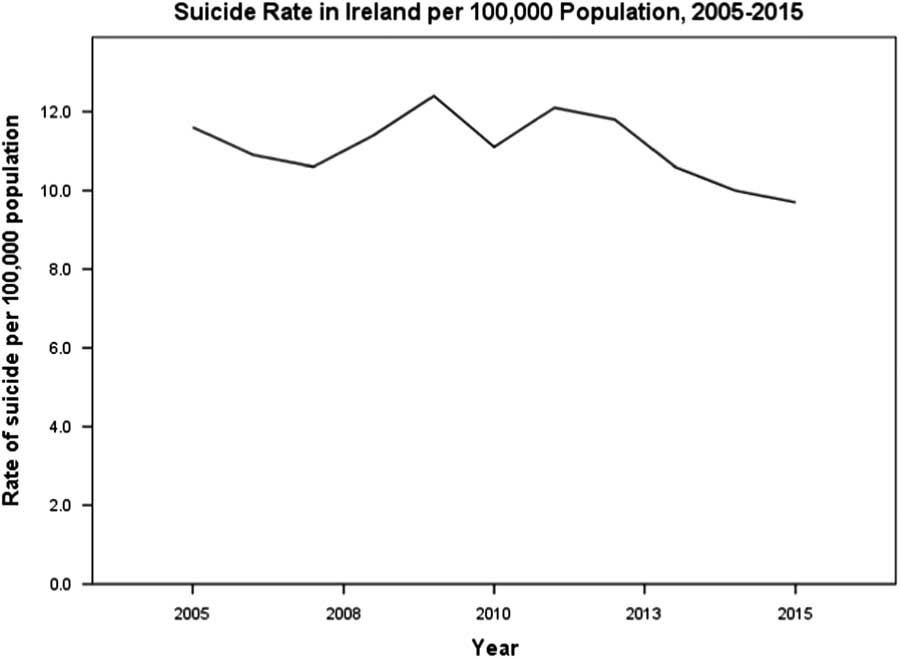In the early 1900s, it was generally thought that Ireland had a low suicide rate, which is said to have increased significantly as the 20th century progressed, with some fluctuation. In the early 1950s, the Central Statistics Office (1954) reported the annual average number of deaths from suicide in Ireland was 89 between 1921 and 1930 (giving a rate of 3.0/100 000 population per year), 98 between 1931 and 1940 (3.3/100 000 population per year), and 77 between 1941 and 1950 (2.6/100 000 population per year) (Kelly, Reference Kelly2016). Suicide was likely under-reported during this period and, in 1967, the Central Statistics Office introduced a new form (Form 104) to improve recording accuracy and facilitate study. During much of this period, suicide was a felony under Irish law and attempted suicide was a misdemeanour; both offences were abolished in 1993 with the Criminal Law (Suicide) Act.