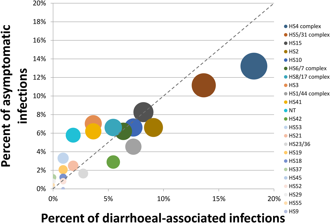 Fig. 1. Proportion of asymptomatic vs. symptomatic diarrhoeal-associated infections. The size of the circle is proportional to the overall prevalence of the capsule type. The legend is sorted from most to least prevalent capsule types.
