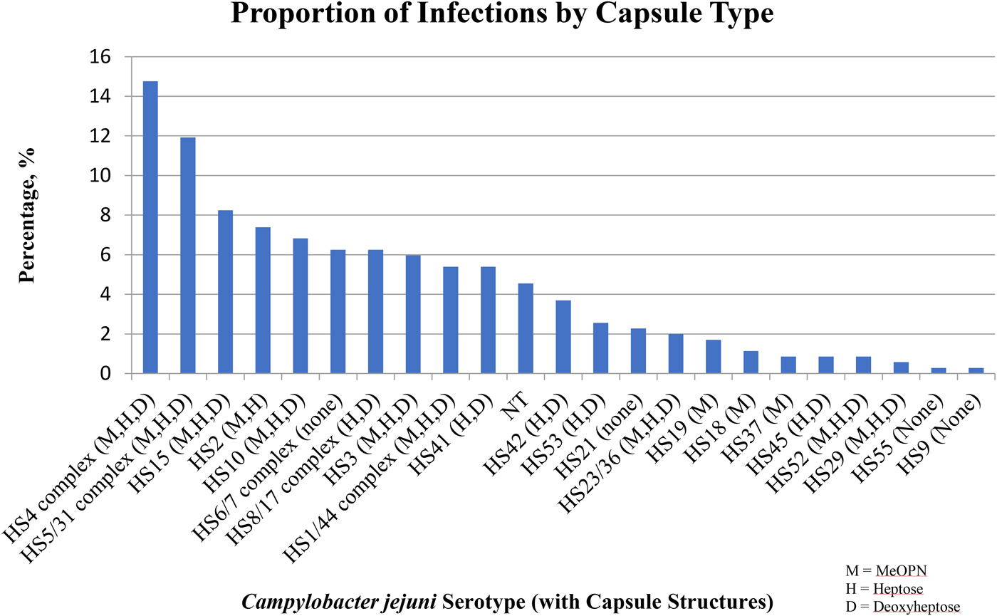 The results presented here are based on the genotypic characterisation of C. jejuni without confirmation of phenotypic expression of specific epitopes. In particular, capsule structure data are based on the genes present in specific capsules. Based on this testing, we assumed that certain phenotypic characteristics were present on the C. jejuni capsule when specific serotypes were detected by the multiplex PCR assay. However, biological variability may modify if and how these structures are expressed during infection and during clinical illness.