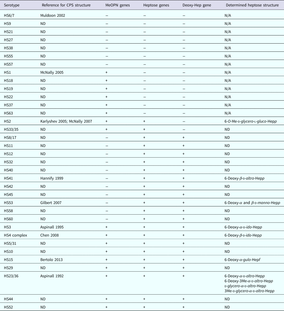 ND, not determined; N/A, not applicable; Hep, heptose; p, pyranose configuration; f, furanose configuration.