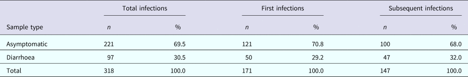 Table 2. The number of total, first and subsequent infections by the sample type