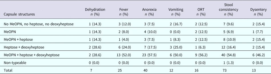 The data were stratified by individual features of the different CPS types as shown in Table 1. Then, we examined whether the presence (or predicted presence based on gene content) of MeOPN, heptose or deoxyheptose residues was associated with disease outcome. Specifically, across all symptomatic infections, 52.0% of children infected with a C. jejuni strain with a capsule containing MeOPN, heptose and deoxyheptose suffered from fever, 57.5% developed anorexia, 50.0% had vomiting, 56.2% needed oral rehydration therapy, 54.8% had at least 1 day with greater than or equal to four semi-liquid/liquid stools and 46.2% suffered from dysentery (Table 3). When comparing CPS types that contained MeOPN, heptose and deoxyheptose vs. those that did not contain one of those three structures, there were no significant differences across all signs, symptoms and management for all or first symptomatic infections (all p-values >0.1). Furthermore, there were no significant differences in the duration of any of the diarrhoeal signs and symptoms across capsule types (data not shown).