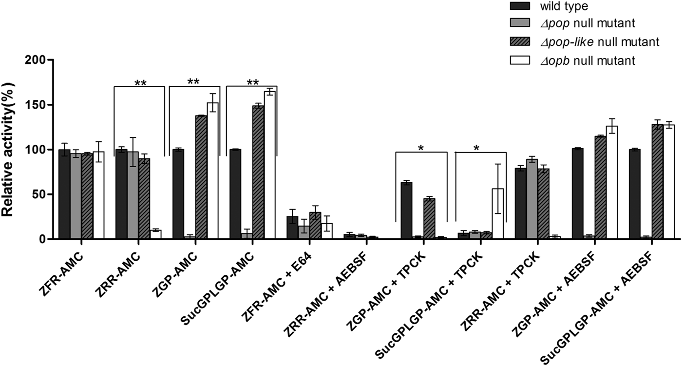 Fig. 2. Enzymatic characterization of null mutant parasites. The hydrolysis of OPB substrates, Z–Arg–Arg–AMC (ZRR–AMC) and Z–Phe–Arg–AMC (ZFR–AMC) and POP substrates Z–Gly–Pro–AMC (ZGP–AMC) and Suc–Gly–Pro–Leu–Gly–Pro–AMC (SucGPLGP–AMC) by lysates of Δopb null mutant, Δpop null mutant and Δpop-like null mutant and T. evansi RoTat 1.2 wild-type parasites was assessed with or without specific inhibitors E64, AEBSF or TPCK included in the assay. Data are presented as means ± s.e.m. (n = 3) of fluorescence values plotted relative to the wild-type as a percentage for each experiment, with no lysate fluorescence deducted from each value as background. **P < 0·001 and *P < 0·05 were calculated in comparison to the wild-type.