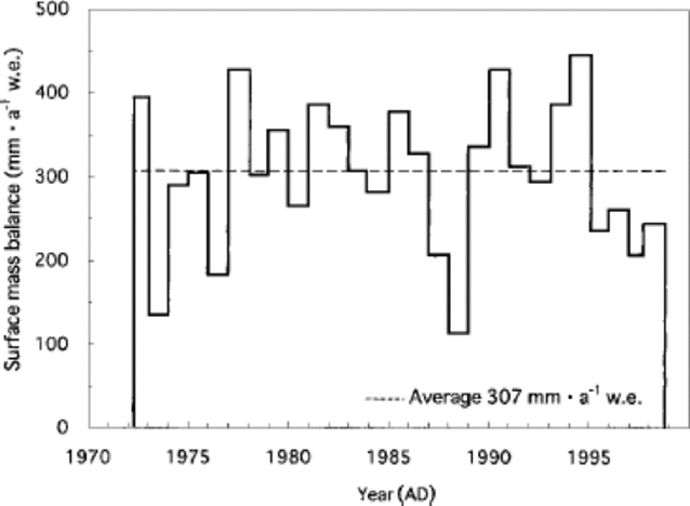 Using the annual-layer boundaries described in section 3, we can determine the surface mass-balance variation over the past 167 years. Figure 7 shows the time series of annual and 10 year averaged surface mass balance. the time series of the yearly surface mass balance at H72 shows a slight increase, with 19 mm (100 years)–1 w.e. over the last 167 years, but on the basis of t-distribution analysis this trend is not significant. Average surface mass balance is 311 mma–1 w.e. for AD 1831– 1998, which is in good agreement with the annual accumulation of 317 mma–1 w.e. obtained by the empirical densification method described in section 3.1, and the value of 307 mma–1w.e. obtained by snow-stake data for AD1973–98.