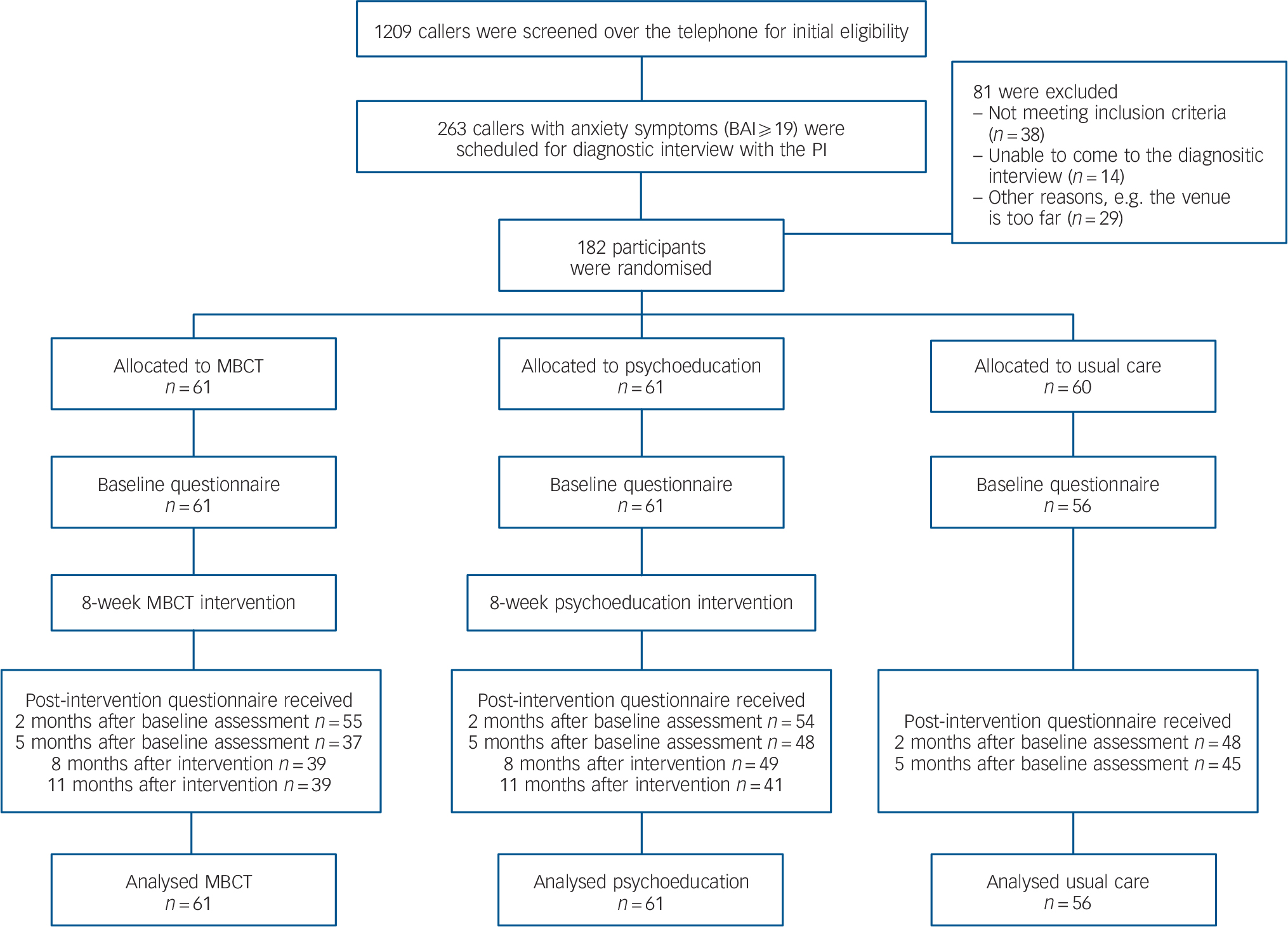 A total of 1209 potential participants were screened by telephone for eligibility. Among these, 263 participants with anxiety symptoms were scheduled for diagnostic interviews and to confirm their eligibility with the principal investigator. In the end, 182 participants who met the inclusion criteria were randomised. Two participants from the MBCT group and one from the psychoeducation group dropped out before the start of the intervention because of time constraints. Four participants who were not happy with the randomisation results quit the usual care control group immediately without returning the baseline questionnaires. Details of the recruitment process are shown in Fig. 1.