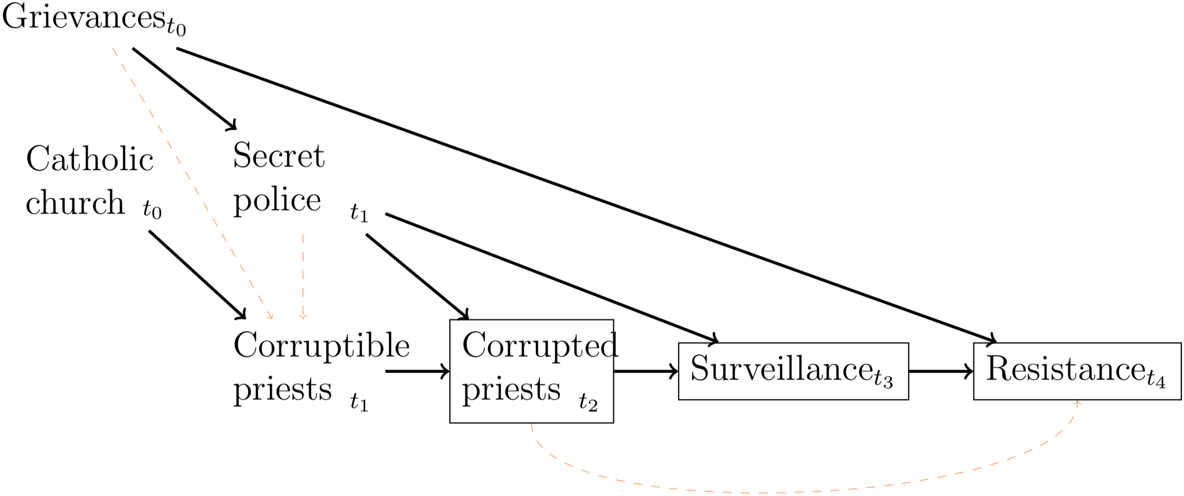 Even if the placement of corruptible priests was exogenous and despite the fact that we observe excellent pretreatment balance, two interrelated threats to inference remain. First, the government may have tried harder to obtain compromising information in certain communities—for example, those with a history of protests. Second, the government may have been more successful at obtaining compromising information in certain communities, particularly those where it already had a strong secret police presence. In both cases, communities would then not have an equal probability of being exposed to a corrupt priest—even if the assignment of corruptible priests was exogenous (indicated by the black arrow from the secret police to corrupted priests in Figure 3).