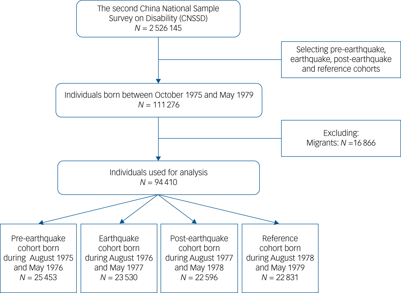 Schizophrenia is a severe mental disorder that results in a significant disability for the patient. In China, more than 50% of mental disabilities in adults are caused by schizophrenia.Reference Li, Chen, Du, Song, Zhang and Zheng1 From a life-course perspective, increasing amounts of evidence have indicated that prenatal maternal stress (PNMS) has a lasting effect on mental health, including increasing the risk for schizophrenia in later life.Reference Clair, Xu, Wang, Yu, Fang and Zhang2,Reference Babenko, Kovalchuk and Metz3 However, the association between prenatal exposure to earthquake and risk of adult schizophrenia has yet to be examined. The present study, using the Great Tangshan Earthquake (GTE) in 1976 as a natural experiment, was designed to capture the potential long-term effect of prenatal exposure to earthquake on the risk of schizophrenia in adulthood, using the difference-in-difference (DID) method, established by examining the regional variations of earthquake exposure across birth cohorts. The findings contribute to the literature by testing the fetal origins hypothesis, particularly regarding the effect of PNMS on adult schizophrenia from a nationwide perspective.