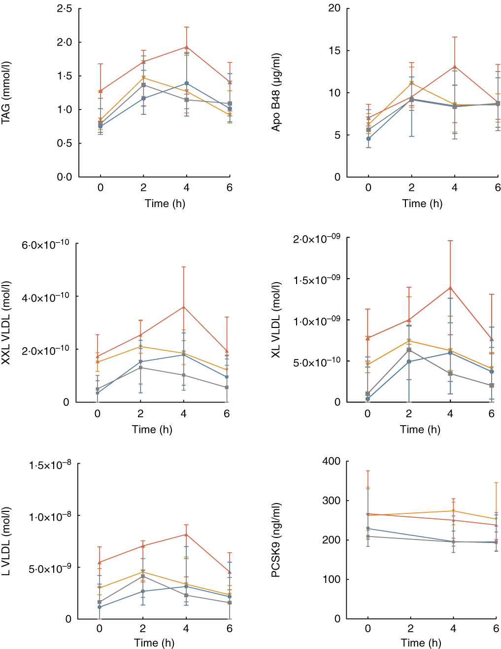 Fig. 2 Postprandial response in TAG, apoB48, the three largest VLDL sub-classes and proprotein convertase subtilisin/kexin type 9. Values are medians and interquartile ranges. P values from analysis of total and incremental AUC (AUC and iAUC) in a linear mixed model for repeated measures. PCSK9, proprotein convertase subtilisin/kexin type 9; FH, familial hypercholesterolaemia; P