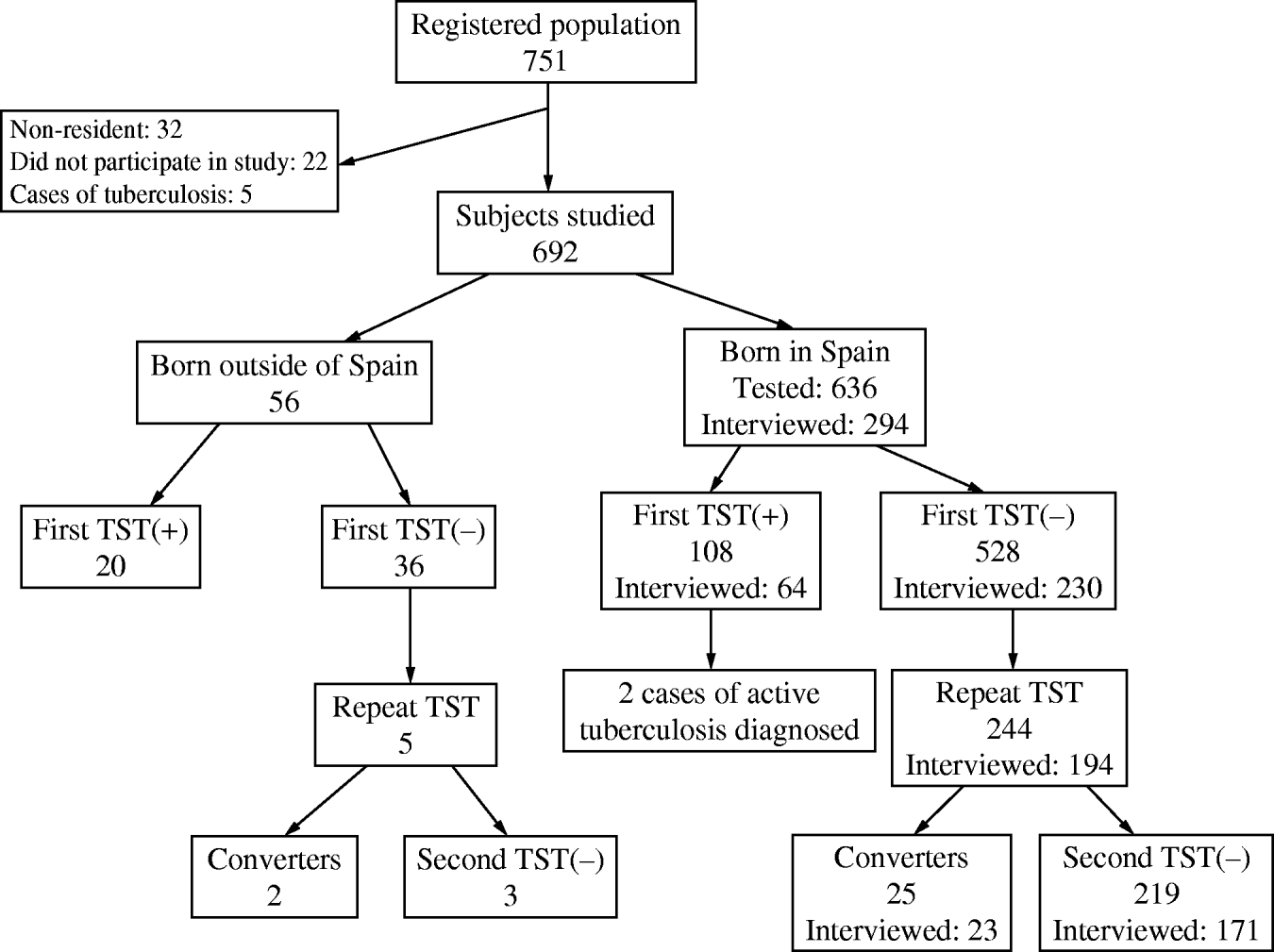 Fig. 1. Flowchart overview of the contact investigation in the resident population born between 1976 and 1995 (a small village in Spain, 2006). TST, Tuberculin skin test.