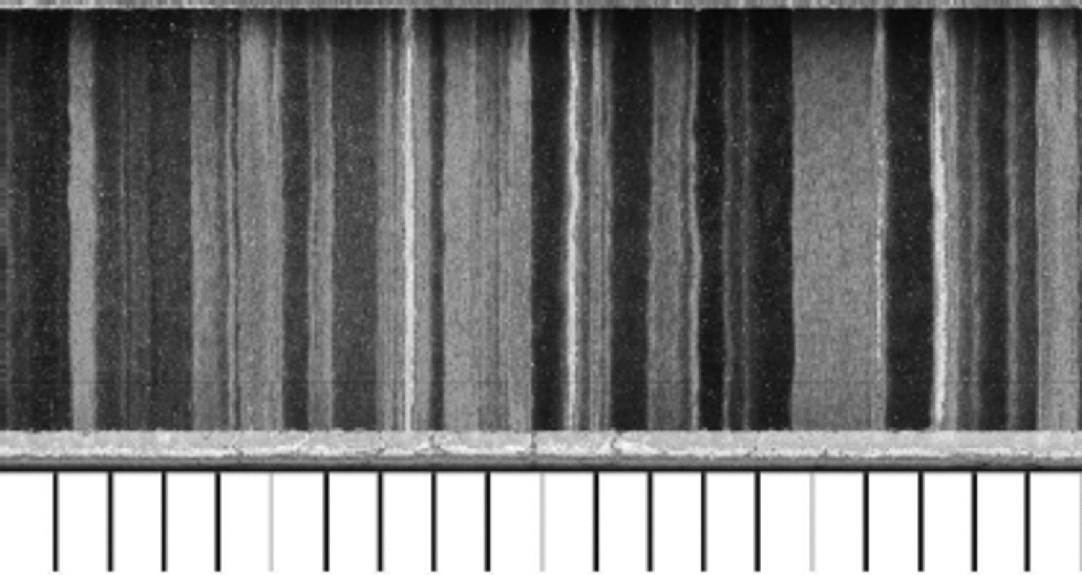 Fig. 3 An example of the results from the line-scan measurements on the NorthGRIP ice core. A section of ice 20 cm long, 9 cm broad and 3.5 cm thick from a depth of 1802.80–1803.00 m is shown. A cm scale is shown below the picture. the visible features are recorded from an indirect light source. the ice appears to be striped with milky (white) and clear (dark) bands. This is a feature observed in ice from cold climatic periods. the milky bands are related to increased concentrations of dust. the sample shown here is from the Last Glacial Maximum, 23 kyr BP, where the annual-layer thickness is on average 1.8 cm.