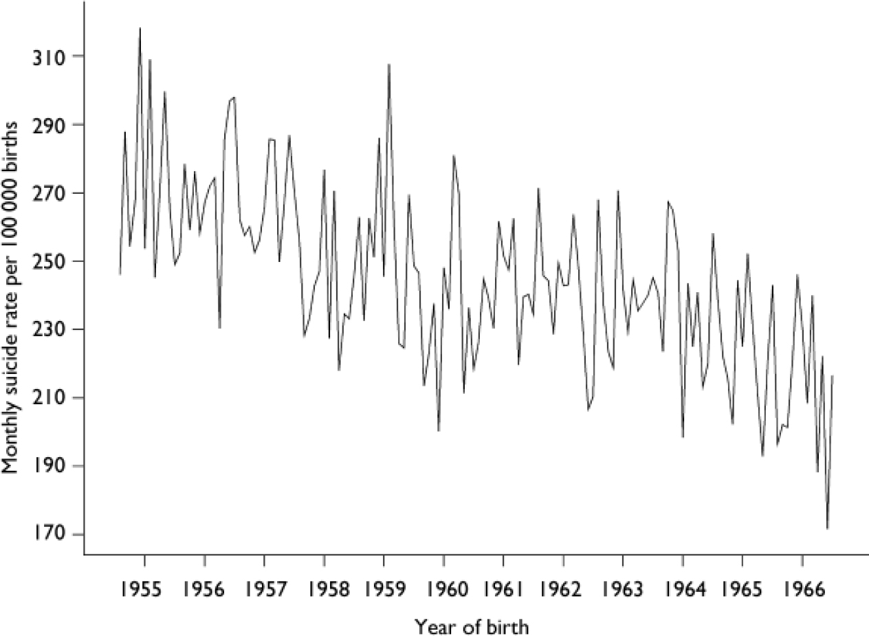 Fig. 1 Monthly suicide rate of people born between 1955 and 1966 who died by suicide between 1979 and 2001.