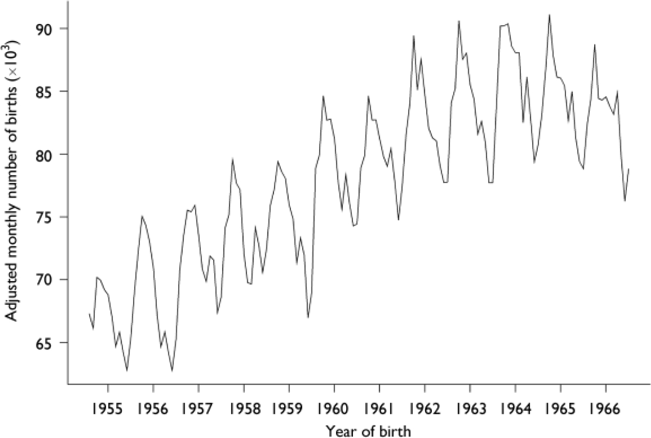 Fig. 2 Adjusted monthly number of births between 1955 and 1966 for people who did not die by suicide between 1979 and 2001.
