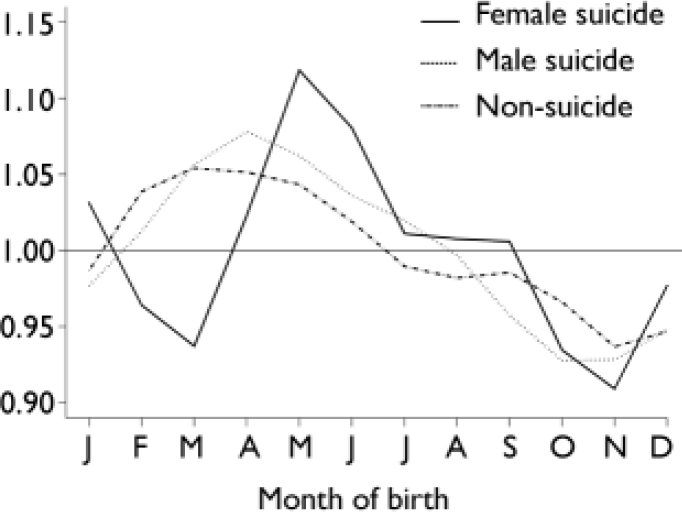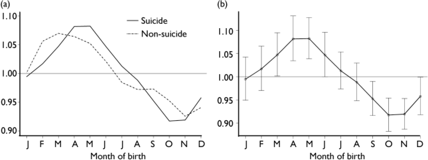 Differential risk effects of season of birth have been reported for several diseases, raising the possibility that early environmental exposure in utero and during infancy may influence the risk in adulthood. Seasonal trends of birth have been established for acute lymphoblastic leukaemia in children (Sorensen et al, 2001a), early-onset non-Hodgkin's lymphoma (Reference Langagergaard, Norgard and MellernkjaerLangagergaard et al, 2003), breast cancer (Reference Kristoffersen and HartveitKristoffersen & Hartveit, 2000), testicular cancer (Reference Prener and CarstensenPrener & Carstensen, 1990), Crohn's disease (Reference Sorensen, Pedersen and NorgardSorensen et al, 2001b ), coronary heart disease (Reference Lawlor, Davey Smith and MitchellLawlor et al, 2004) and brain tumours (Reference Brenner, Linet and ShapiroBrenner et al, 2004). In their reviews, Castrogiovanni et al (Reference Castrogiovanni, Iapichino and Pacchierotti1998) and Torrey et al (Reference Torrey, Miller and Rawlings2000) found that more patients with schizophrenia, Alzheimer's disease, epilepsy and narcolepsy are born in December and January, whereas affective disorders, alcohol dependence, autism, dyslexia, and multiple sclerosis are reported more frequently in those born during spring and summer months. Month of birth has also been linked to human longevity (Reference Doblhammer and VaupelDoblhammer & Vaupel, 2001). However, few studies have investigated the effect of month of birth on suicide rates. Huntington (Reference Huntington1938) reported that the distribution of birth month for those who died by suicide was different from those who did not. Pokorny (Reference Pokorny1960) found an overrepresentation of suicide cases in which the person was born in the month of July. Kettl et al (Reference Kettl, Collins and Sredy1997) reported variations in season of birth for suicide among Alaskan natives, with more suicide deaths in those born in the summer. Chotai & Asberg (Reference Chotai and Asberg1999) reported that people born in winter in Sweden were significantly more likely than those with other birth seasons to have used hanging as a suicide method. Using 12-year suicide data from Cheshire, UK, an increased risk of violent suicide, particularly hanging, among people born in the summer was found by Salib (Reference Salib2002), quite the opposite of the Swedish study. However, the above studies share some major methodological limitations, including small sample size, lack of controls and the use of inappropriate statistical methods.