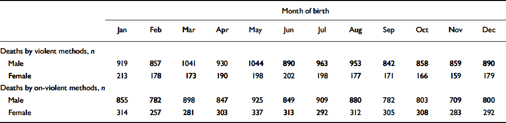 Table 2 Frequencies of suicides by month of birth, method of suicide and gender of people born between 1955 and 1966 who died by suicide 1979–2001