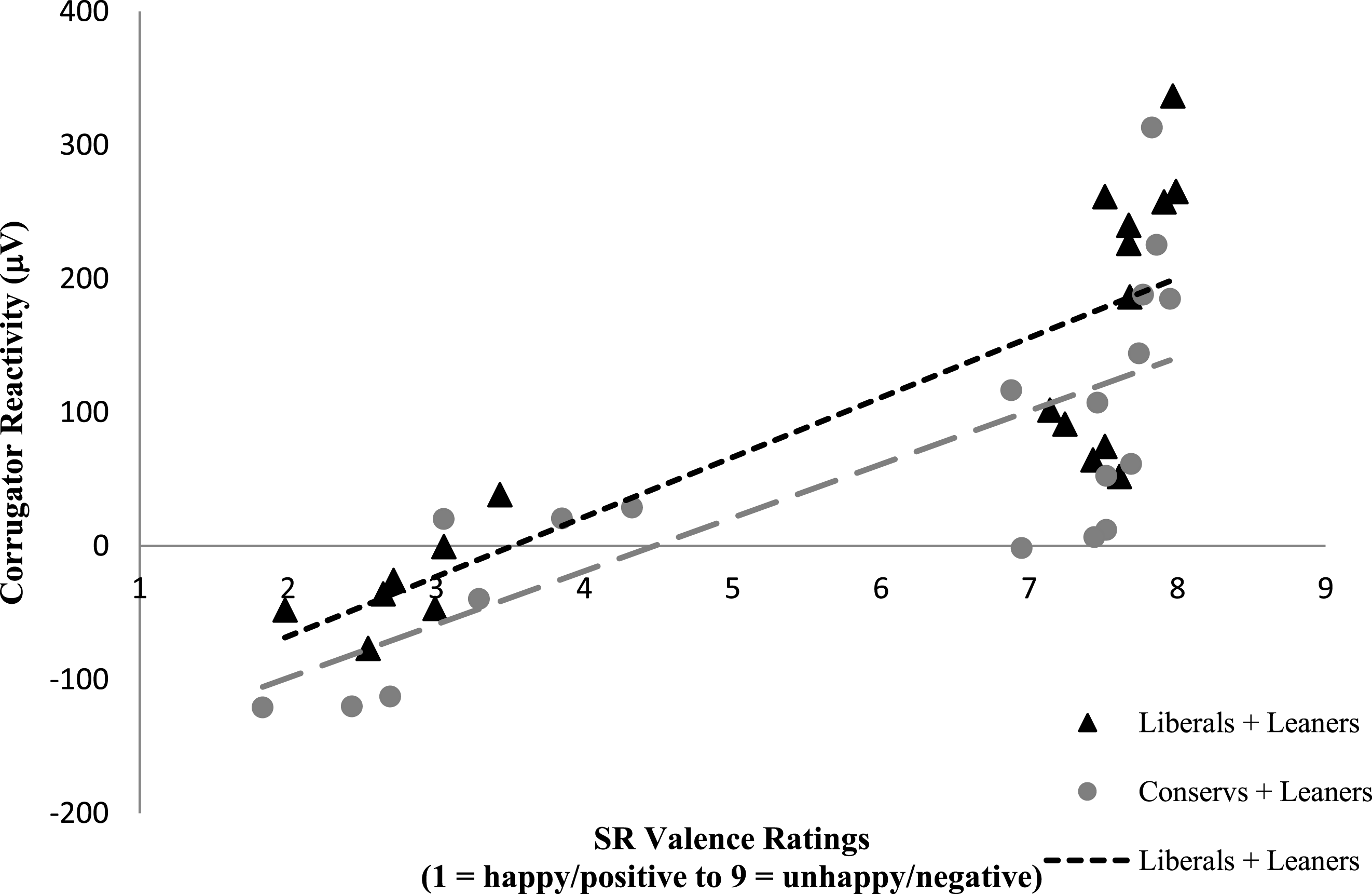 ). Liberals, in short, have a consistently higher degree of corrugator activity for all images, suggesting they have more emotionally expressive faces.