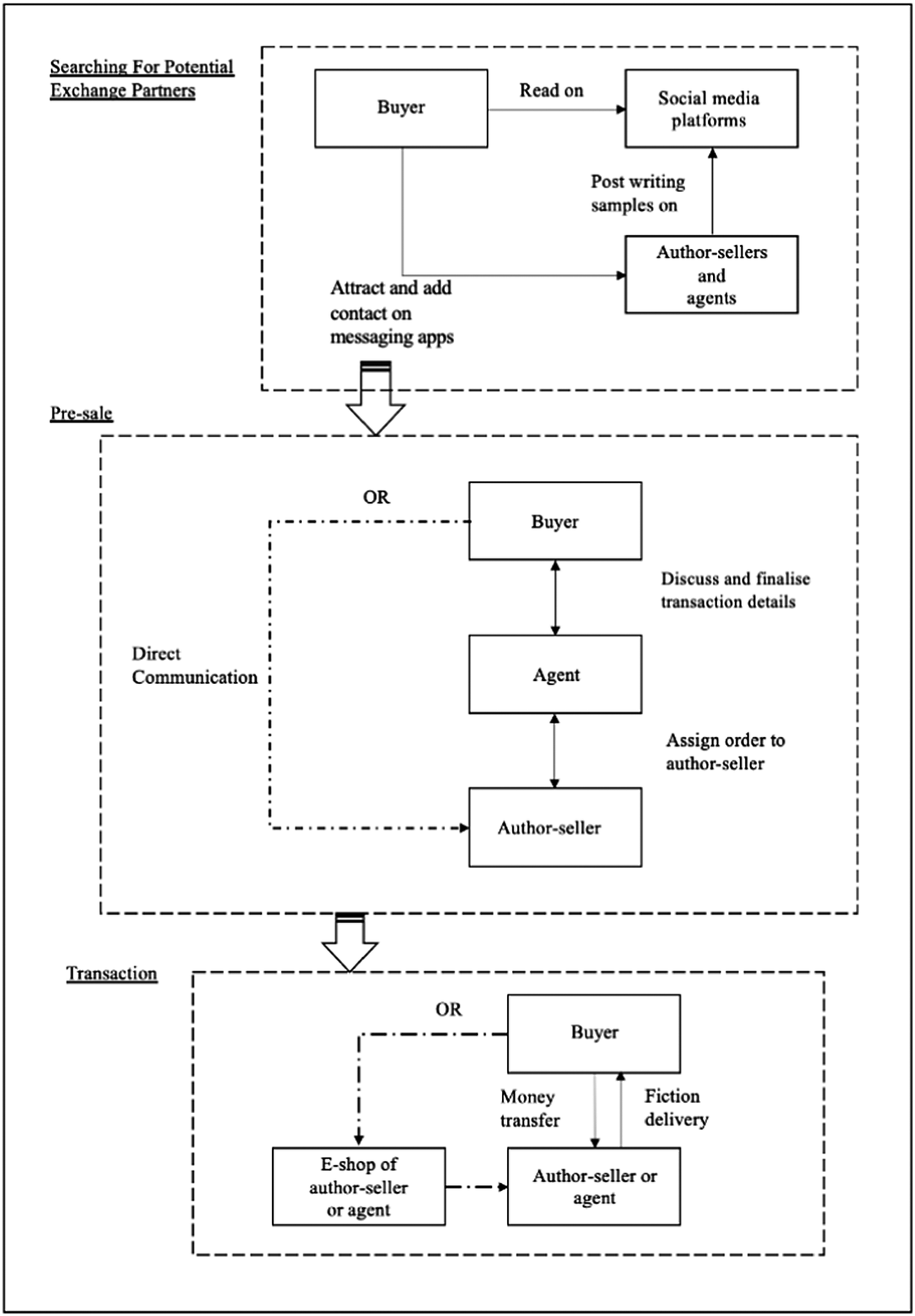 Participants coordinate their market activities and embed sale, transaction, post-sale, and marketing activities into legitimate social media platforms (see Figure 1). These online platforms allow participants to use nicknames rather than real names, which prevents their being identified. To avoid attracting attention from platform administrators, participants use insider language to refer to pornographic content and erotic organs; for example, “XP” means sexual preference, and “sandwich cookie” (jia xin bing) means threesome. To attract buyers, author-sellers and agents post writing samples on their social media platforms. When a buyer indicates interest, they follow online instructions provided by the author-sellers or agents to add the latter as friends on messaging apps. Potential buyers can request additional writing samples from author-sellers or agents and negotiate order details, such as content, price, and delivery date.