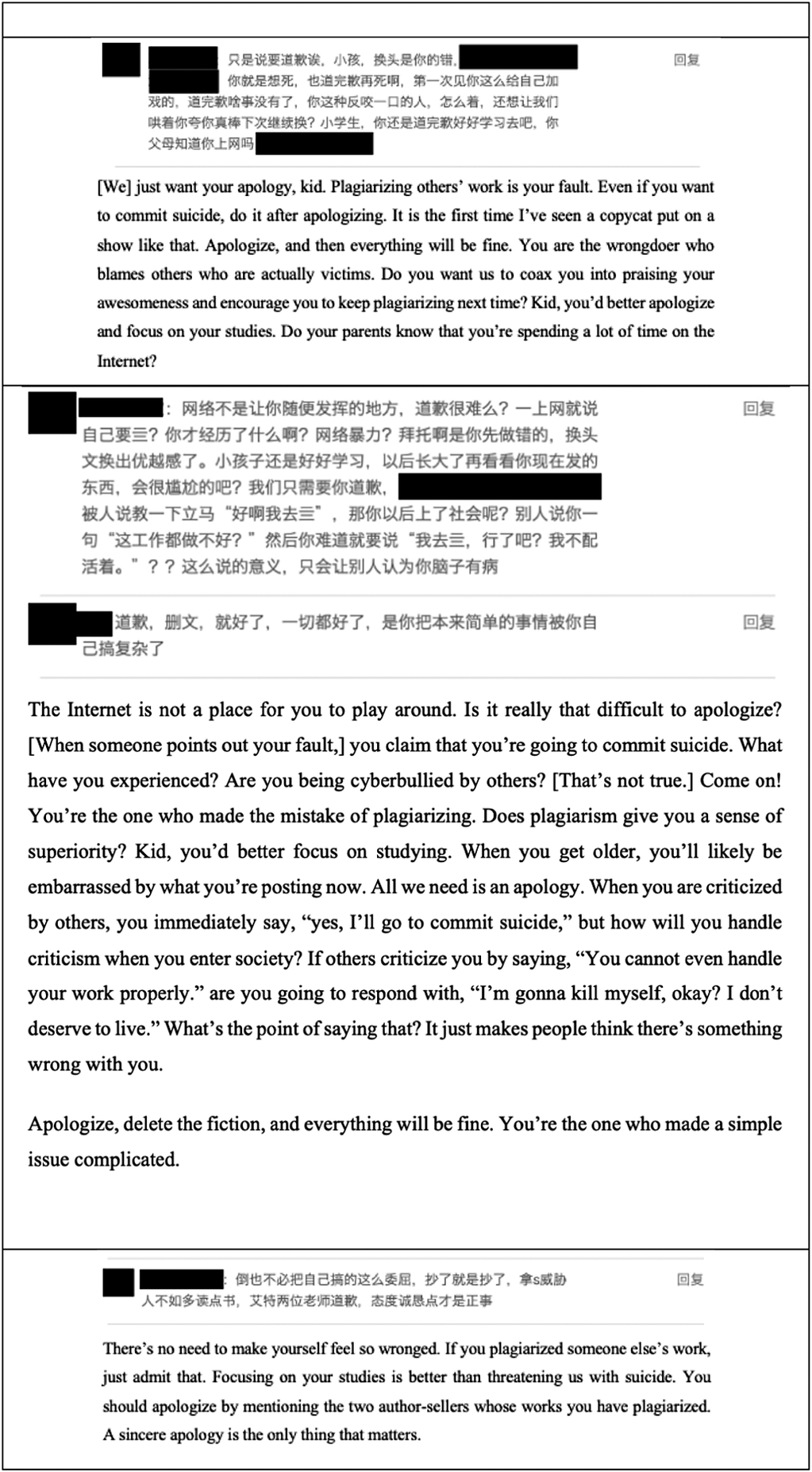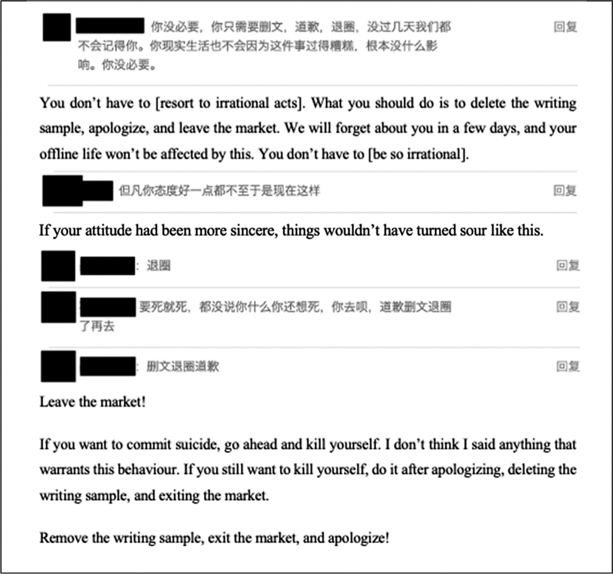 In contrast, author-sellers who fail to develop appropriate strategies to safeguard their standing risk reputational ruin and eventual expulsion from the market. Figure 2 depicts a post from an author-seller who was accused of plagiarism and deployed the emotional blackmail tactic [Forward Reference Forward1998] rather than neutralisation techniques to avoid blame. The author-seller posted on her profile that she would commit suicide if the buyer continued to accuse her of plagiarism. The threat of suicide did not constrain the buyer’s behaviour, instead resulting in strong resistance from the buyer, who persistently requested an apology from the author-seller. The author-seller’s transgressive action was soon questioned and criticised by other norm-abiding market participants (see Figure 3). Although the apology did not change the fact of her plagiarism, it was a signal that the norm violator had to convey in order to admit her fault and acknowledge the harm caused to the market by her actions. Being able to apologise also signals a norm violator’s accountability for damages and willingness to remedy damages and accept punishment [see Tavuchis Reference Tavuchis1991; Schneider Reference Schneider2007]. In contrast, as shown in Figure 2, the author-seller’s attempt to manipulate the buyer and avoid apologising signalled immaturity and insincerity to buyers. In an interview, one experienced buyer emphasised: “it is useless to threaten us [buyers]. [Because] we don’t even care.”Footnote 43 When buyers perceive that their freedom to criticise an author-seller’s norm-breaking behaviour is being challenged, they often react in dramatic ways: not only do they leave negative comments on the author-sellers’ profiles, but they also share information about the author-sellers’ dishonest behaviour on different forums and various social media platforms, which may ultimately expel these author-sellers from the market [see Figure 4; Brehm and Brehm Reference Brehm and Brehm1981].