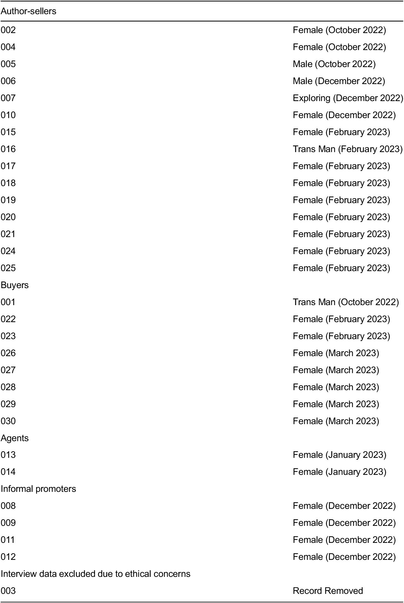 We used the snowball sampling method and conducted interviews with 30 respondents from various platforms, including eight buyers, 16 author-sellers, two agents and four informal promoters (see Table 1). For ethical reasons, we exclusively recruited adult respondents (i.e. individuals above 18 years old), all of whom provided informed consent. The interviews were conducted synchronously (e.g. face to face) and asynchronously (e.g. via private messages). Each face-to-face interview lasted approximately two hours, while each asynchronous interview took two to five days. All interviews were transcribed within 48 hours of completion, and the recordings and private messages were permanently deleted. The names of the participants were anonymised, but information regarding their age, gender, sexuality, and educational level was collected for research purposes. Although we conducted 30 interviews, only the interview data from 29 of the interviewees was eventually used for this article. This is because one interviewee (i.e., author-seller) requested that we pretend to be her customers and leave positive comments on her profile. We declined her request and decided not to use the data we had collected from her due to conflicts of interest and ethical concerns. The interview materials generated 261,096 words in Chinese, serving as a primary source of data for this research. Interview data is particularly helpful when it comes to understanding participants’ motivations for getting involved in the market, their personal experiences of trading with others, the daily operations of the market, and their use of different strategies to coordinate exchanges, negotiate informal contracts, and settle disputes.