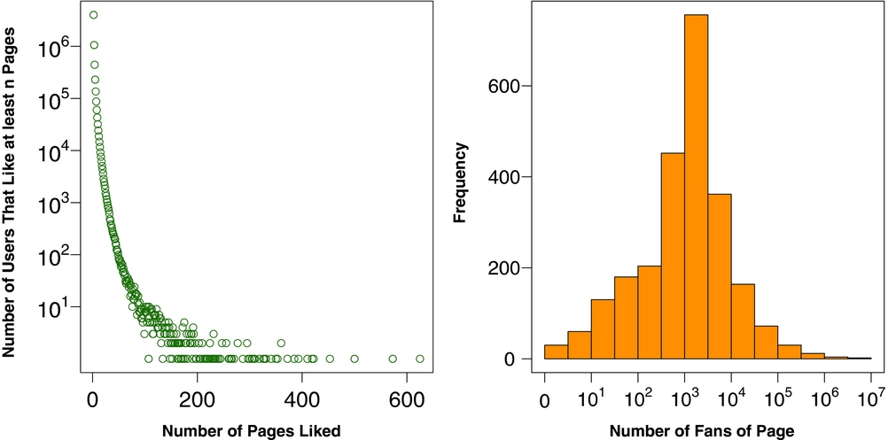 FIGURE 1. The Left Panel Shows the Distribution of the Number of Pages that Each User Likes; the Right Panel Shows the Distribution of the Number of Fans that Each Page Has