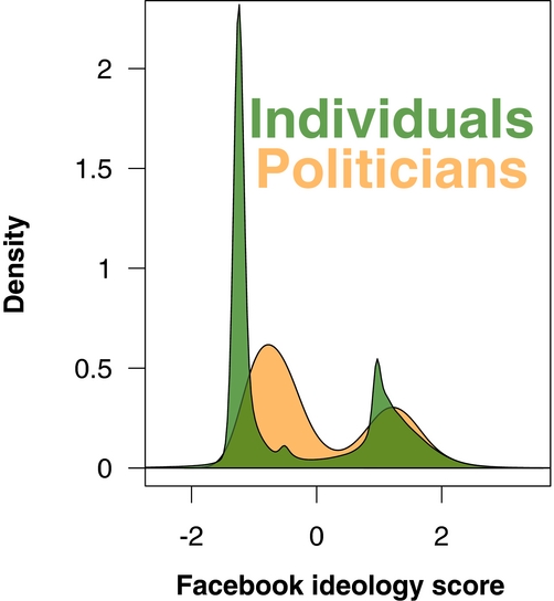 FIGURE 2. Density Plots of Ideological Estimates of 1,223 Politicians and 6.2 million Individuals.