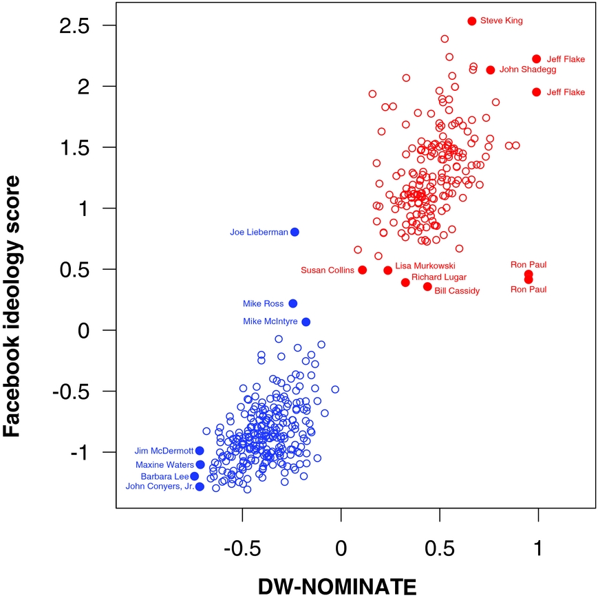 FIGURE 3. Scatter Plot Showing the Relationship between the Facebook Based Ideology Measure and DW-NOMINATE