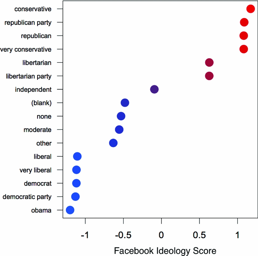 We next turn to the validation of the individual-level ideological estimates. First, we computed the average ideology score of individuals based on their stated political views. On Facebook users may fill out a free response field that many users fill out called “political views.” Many users type the same things in, such as “Democrat,” “Republican,” “Liberal,” or “Conservative.” We took all labels that more than 20,000 users had used and calculated the average ideology score for the group, as well as the 95% confidence interval for that estimate. The results are shown in Figure 4.
