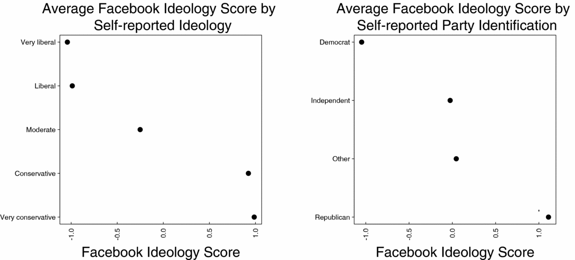 FIGURE 5. Average Facebook Ideology Score of Users Grouped by the Users’ Ideology (left panel) and Party Identification (right panel) from a Survey Conducted Through the Facebook Website