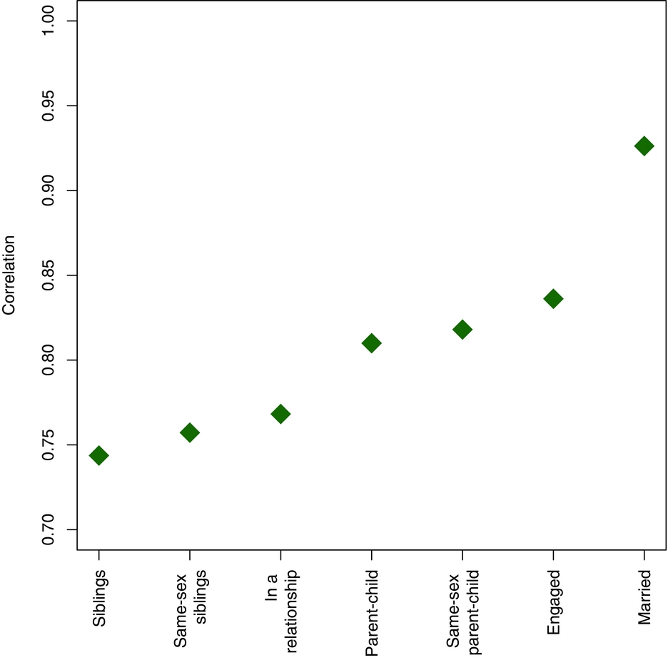 Since Facebook allows users to identify their familial and romantic relationships, we were able to test for ideological similarity across these social links. We began by pairing all individuals with their siblings, parents, or romantic partners. We then calculated the Pearson correlation for each group. The results are shown in Figure 7. The figure shows that married couples have the highest correlation in ideology, while engaged couples have the second highest value. Correlations within the nuclear family have lower values, with parent-child relationships being stronger than sibling relationships. The fact that the correlation between siblings is lower than the correlation between parent-child pairs may be due to the fact that our sample skews toward younger users and that the set of parents on Facebook are more likely to be similar to their children across a range of factors than parents who have not yet joined the website.