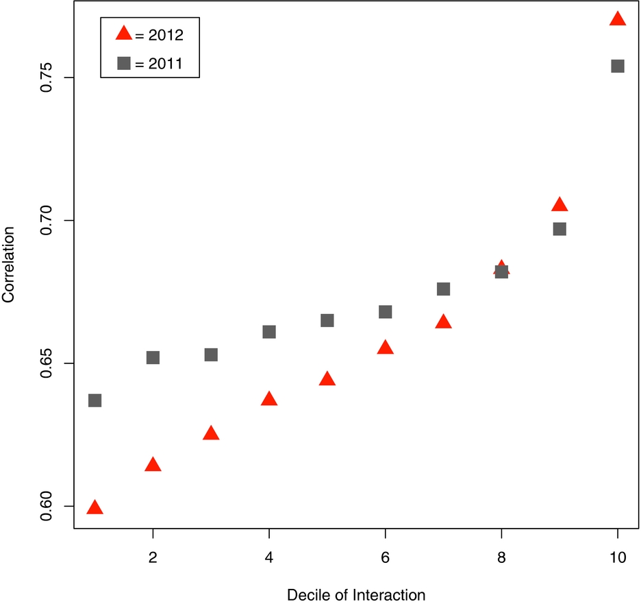 Using the decile measure of tie strength, we then calculated the correlation between user and friend ideology on each set of dyads for both 2011 and 2012 (see Figure 8). For both years the correlation in friends’ ideology increases as tie strength increases. The proportion of interaction between friends is a better predictor of similarity of ideology between friends in 2012 than in 2011, again suggesting that in 2012 friendships are more politically polarized than in 2011. We caution that this correlation may increase for other reasons, such as better measures of ideology in 2012 owing to users liking more political pages, or perhaps to changes of the makeup of the set of individuals for whom we can estimate ideology. Although we can only estimate ideology for about 2% more people in 2012 than 2011, the change in the sample could be enough to account for the difference in 2012.