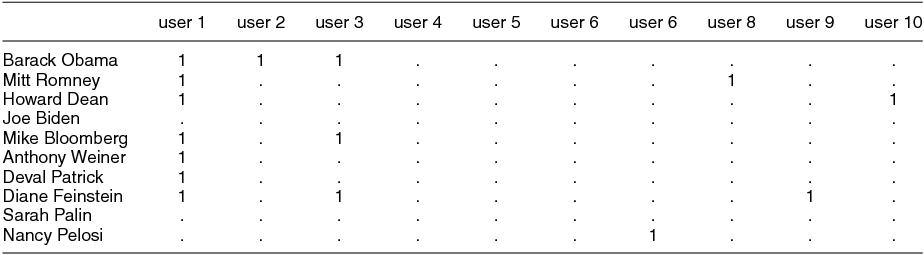 Note: Entries in the matrix are dichotomous, where 1 means that the user has liked the page and . means that the user has not.