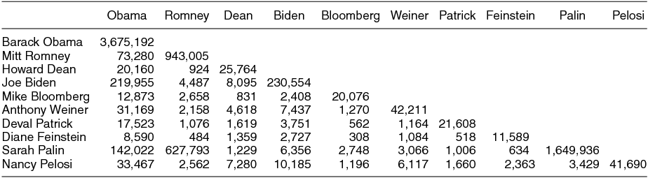 To estimate ideology our approach is similar to the approach used by Aleman et al. (Reference Aleman, Calvo, Jones and Kaplan2009) to estimate the ideal points of legislators in the United States and Argentina using cosponsorship data, and is similar in principle to the use of Relational Class Analysis by Goldberg (Reference Goldberg2011) and Baldassarri and Goldberg (Reference Baldassarri and GoldbergForthcoming). Estimating separate parameters for users and pages, as is typical of estimation techniques like DW-NOMINATE or Bayesian analysis (Clinton, Jackman, and Rivers Reference Clinton, Jackman and Rivers2004), would be difficult on a large, sparse matrix. Instead, we construct an affiliation matrix between the political pages in which each cell indicates the number of users that like both pages. We do not use the original (two-mode) dataset of connections between users and political figures, which is organized as an X = r × c matrix, with r = 1, 2. . .R users and c = 1, 2. . .C pages, but instead use an affiliation matrix (Table 2), A = XX′. In this affiliation matrix, the diagonal entries are the total number of users that like each page and the off-diagonal entries are the number of times an individual user likes both pages. Table 2 shows the first ten rows and ten columns of the affiliation matrix, A. The table shows that there are very significant differences in the total number of users that like each page, as well as notable differences in the number of users that like each pair of pages.