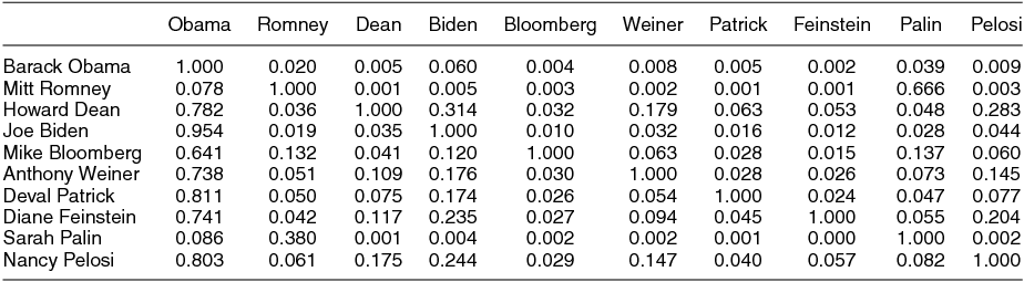 Next, we calculate the ratio of shared users by dividing the number of users that like both pages by the total number of users that like each page independently, which produces an agreement matrix, G = aij/diag(ai ), as depicted in Table 3. Because each page has a different number of fans, the denominator changes and the upper and lower triangles of the new square matrix, G, are not identical. For instance, Barack Obama has many fans on Facebook (the most of any page in the data set) so the values in the first row are small as they are all divided by the number of fans that Obama has. However, many of the fans of other candidates also like Obama, so those values are relatively high.