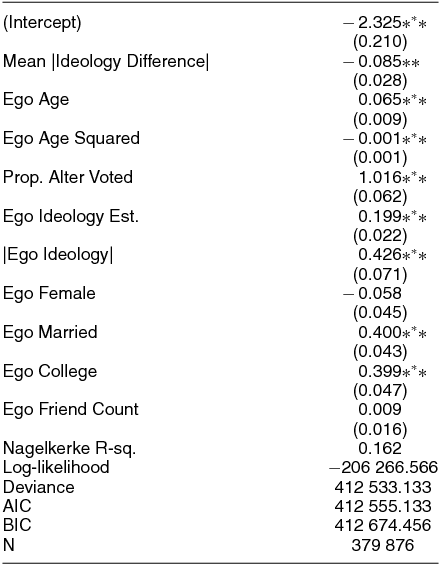 TABLE 4. Logistic Regression of Ego Validated Voting in 2010 on Ego Covariates and Alter Characteristics of Ideology and Turnout.