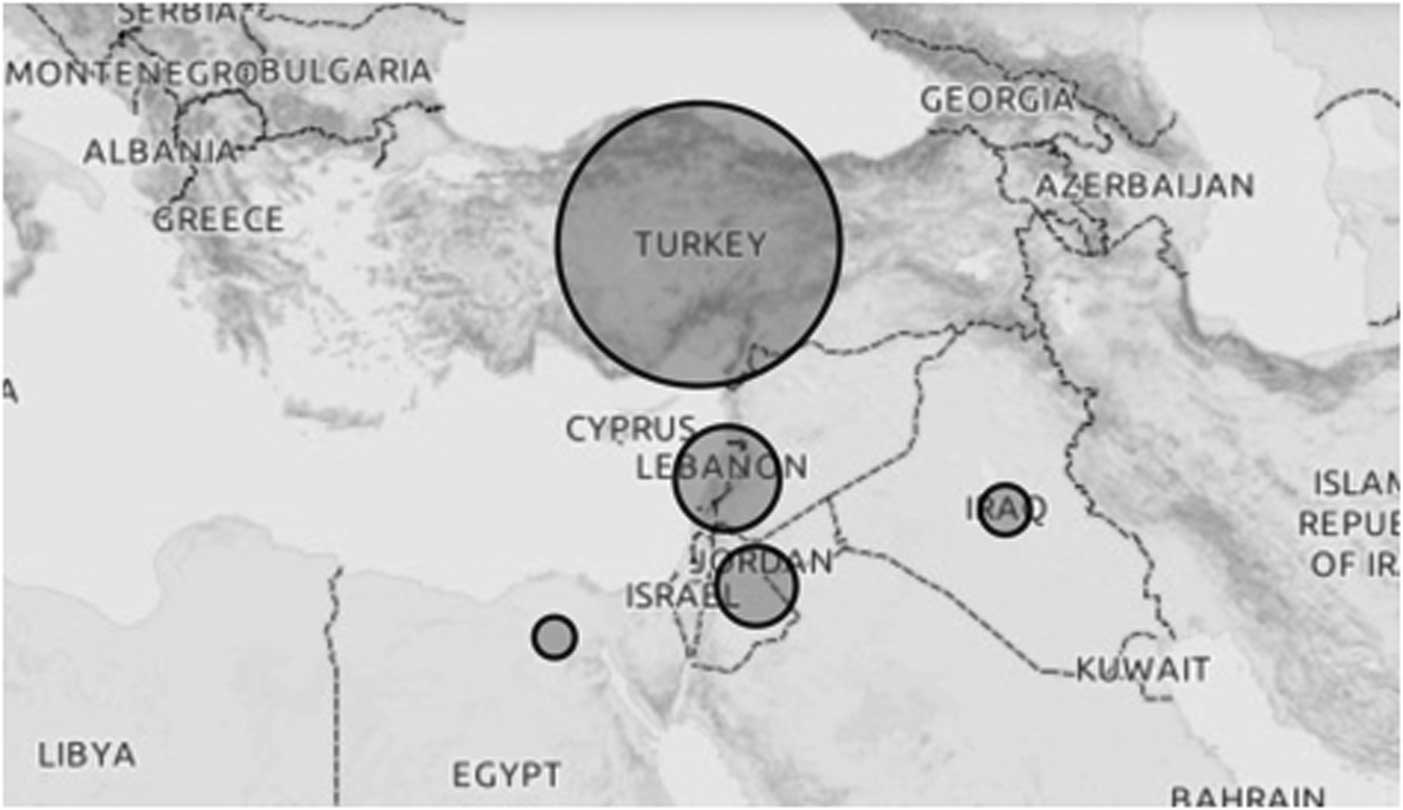 Since the beginning of the conflict in Syria in 2011, millions of Syrians have fled their homes and migrated to neighboring, or more distant countries, with Lebanon, Jordan, Turkey, and North Africa having the greatest influx of Syrian migrants.Reference El-Khatib, Scales, Vearey and Forsberg 1 Turkey, the largest host country among those mentioned 2 (Figure 1), has made it clear that it will not close its borders to those escaping the war and that it will welcome them in line with its “open door” policy and provide “temporary protection.” In this paper, the term “refugee” is used to describe Syrians under temporary protection of Turkey.