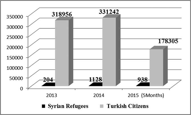 Many Syrians have immigrated to Turkey since April 2011 due to the civil war in Syria. According to data obtained from the Ministry of Interior Directorate General Migration Management dated March 2016, the number of Syrian refugees in Turkey was 2,747,946. Some of the Syrian refugees live in camps, whereas 2,475,134 live in metropolitan areas, such as Ankara. The number of EMS calls made by Syrian refugees rose from the beginning of 2011 to the first five months of 2015. The EMS system is used by Syrian refuges in all time periods, but usage after 18:00 was more common. The first five stations, which responded to nearly one-half (42.0%) of all calls, are in the Altındağ region, which is densely populated by Syrian refugees. In Ankara, prehospital EMS was used mostly by Syrian refugees less than 18-years-old, which likely reflects the age distribution of Syrian refugees. Patients were mostly hospitalized in public hospitals.