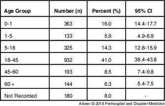 Calls made by Syrians and responded to by ambulance had a diverse age distribution (Mean: 25; Medium: 23; Min: 0; Max: 104; SD: 21). Most of the cases were in the 18-45 years age group (41.0%; n=932). The distributions of the other groups were: 0-1 year age group (16.0%; n=363); 5-17 years age group (14.3%; n=325); 46-60 years age group (8.5%; n =193); ≥60 years age group (6.3%; n=144); and 1-5 years age group (5.9%; n= 133). Ambulances were primarily called for patients <18-years-old (36.1%; n=821); the age group of 180 patients was not recorded (Table 1).