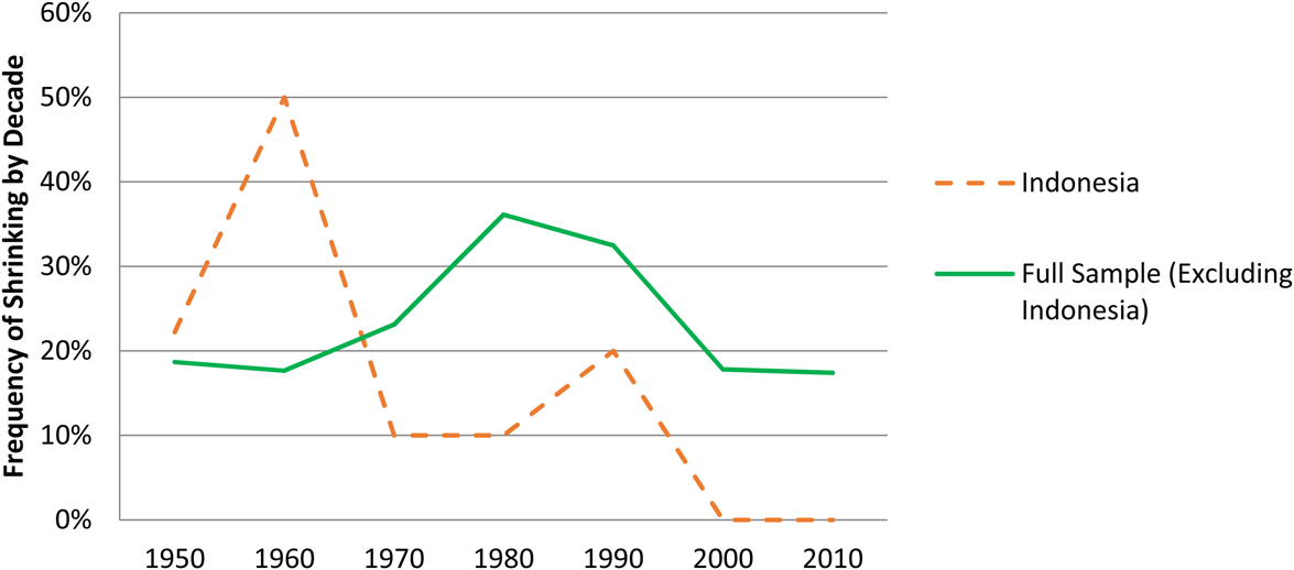 Figure 1. Frequency of shrinking per decade 1950–2010 – Indonesia and low-income countries.