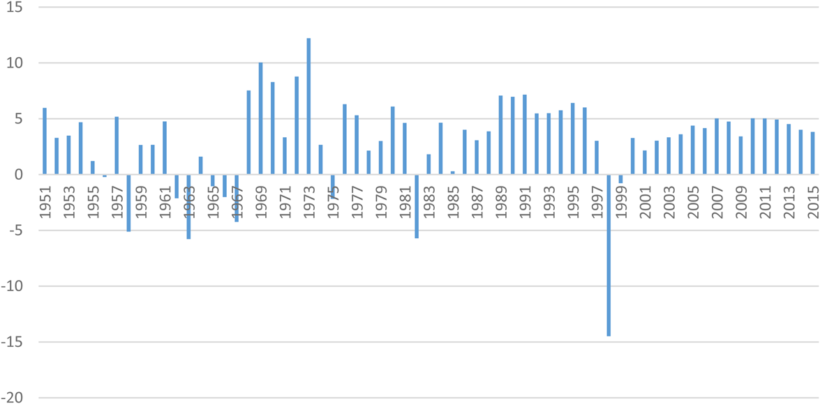 Indonesia's growth and shrinking record has some distinguishing features. The frequency of shrinking for Indonesia is equal to the average throughout Asia for the entire period, but seven out of its 11 shrinking years occurred in the 1950s and 1960s (see Figure 3). The new nation emerged under the leadership of President Sukarno, who came to power with a nationalist platform to develop the economy and society. The 1950s represent a politically tumultuous decade marked by increasing social tensions. Despite the general elections of 1955, which were followed by local elections, a clear-cut democratic system failed to emerge (see V-Dem, 2020). Instead, Sukarno established an authoritarian regime under the concepts ‘Guided Democracy’ and ‘Guided Economy’. At the time, Indonesia was one of the poorest countries in Asia and fit well into the North et al. categorisation of a basic natural state. Based on data from the Conference Board, the average income per capita in Indonesia after independence was 30% below that of the rest of Asia and 10% below that of African countries. The main source of growth was agriculture, which contributed 60% of GDP and employed over 80% of the labour force. However, food shortages and malnutrition were common. The spells of growth rates were regularly accompanied by three-digit rates of inflation between 1962 and 1968, pulling the rug out from under the poor and vulnerable.