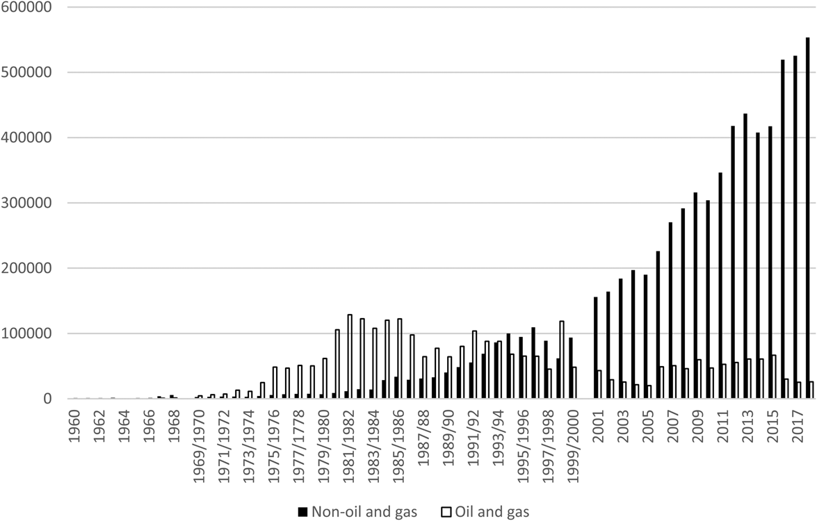 A closer look, however, reveals some issues that warrant further clarification. In Figure 4, we see how oil taxes start to increase after the oil shock in 1973 and peak in 1981. We can also see that non-oil taxes were negligible in the Sukarno era and during the first half of the Suharto regime but that there is a shift starting with declining oil prices. As regards tax revenue and GDP, it is clear that revenues soared as an effect of rising oil prices (Hill, Reference Hill2000). In fact, the increase in tax revenue in the 1970s is solely a result of escalating oil prices. With the declining oil revenues in the early 1980s, there was a slump in tax collection. It is not until the second half of the 1980s that we see a clear shift in the improvement in tax revenues. It may thus be argued that, with increasing oil revenues, which came with the oil boom of the 1970s, the pressure to reform the taxation system was minimal until a steep decline in the price of oil.